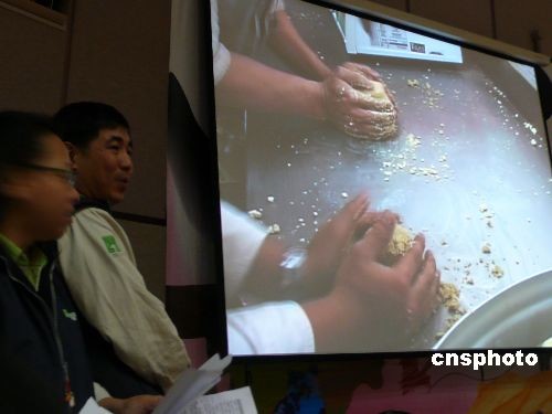 大陸贈臺一對大熊貓“團(tuán)團(tuán)”和“圓圓”二十三日晚間抵達(dá)臺北,住進(jìn)臺北市立動物園的新光特展館。圖為動物園發(fā)言人金仕謙(左二)介紹大熊貓的精制飼料——窩窩頭的做法。 中新社發(fā) 路梅 攝