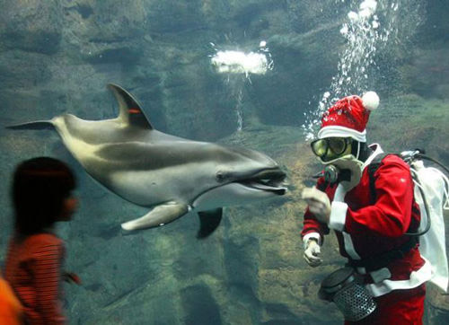 在日本大阪,圣誕老人穿上潛水裝,喂養(yǎng)水族館里的白海豚。