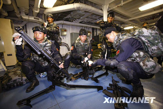 12月25日,海軍特戰(zhàn)隊(duì)員在軍艦艙室里擦拭武器。