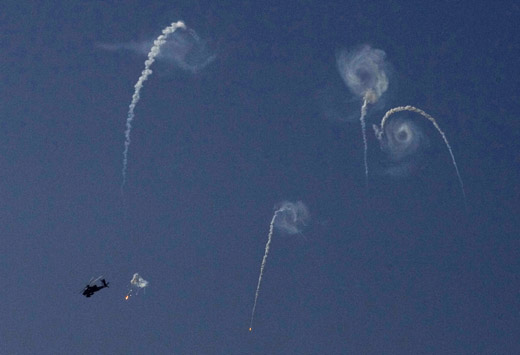 28日,以色列直升機(jī)在加沙地帶上空發(fā)射火箭。