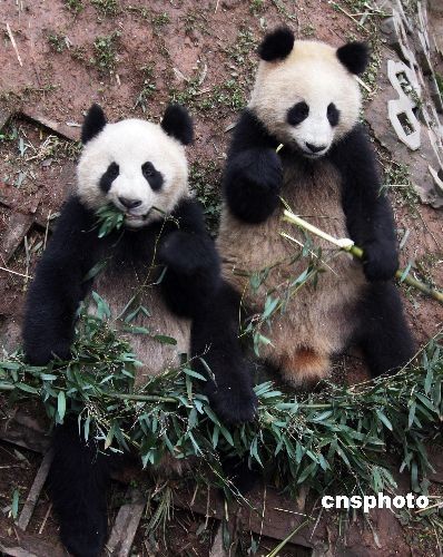兩只熊貓?jiān)谘虐脖谭鍗{熊貓基地豹子山悠閑吃竹子。