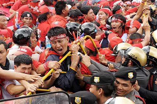 12月30日,泰國警察在為新總理阿披實(shí)開路進(jìn)入外交部時和前總理他信的支持者發(fā)生沖突。由于他信的支持者“紅衫軍”包圍國會,阿披實(shí)被迫易地至外交部發(fā)表施政演講。