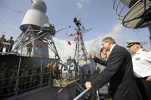 德國國防部長弗朗茨·約瑟夫·容為參加歐盟領(lǐng)導(dǎo)的打擊海盜行動的德國官兵送行。