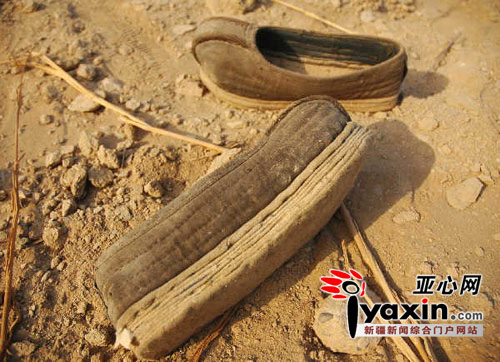 干尸出土時所穿的圓口千層底兒布鞋,鞋子底厚、針腳大,新疆考古所研究員呂恩國認為是生者為逝者專門做的一雙冥鞋。