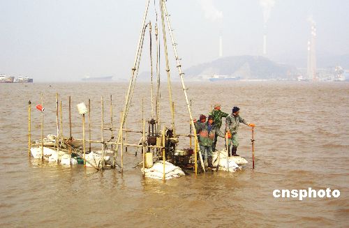 1月12日9時30分許,4名大橋施工員在浙江省臺州市海門港椒江二橋建設(shè)工地上測量時,被上漲的潮水困在港內(nèi)工地上。接到報警后,臺州邊防支隊(duì)迅速派遣公邊艇前往營救,經(jīng)過近1個時努力,4人終于成功脫險。中新社發(fā) 郟策 攝