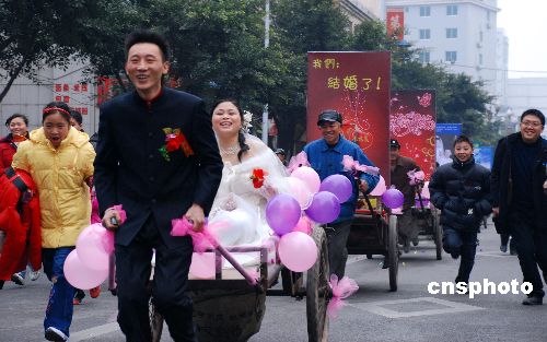 1月13日上午,一支由新郎拉著板車載著新娘的板車迎親隊,浩浩蕩蕩經(jīng)過重慶梁平縣城,沿途向行人撒喜糖、紅包,然后奔向新家。這支新穎、獨特的迎親板車隊,引得沿途行人駐足觀看,許多汽車主動停下讓道,并鳴笛向他們祝賀。沿途許多市民對他們這場婚禮贊不絕口,送上對新人的祝福。新郎周剛介紹,新娘黃林鳳家住廣西來濱市,她愿從那么遠(yuǎn)的地方嫁過來,讓他很感動,就想以一種特別的方式娶她,因此請人策劃了這場婚禮。新郎稱,租汽車需花2000元左右,租10輛板車只花了400元,用板車比汽車節(jié)約,其實節(jié)約這點錢對他們來說不算什么,但主要的是這種形式終身難忘,要的是倡導(dǎo)婚事新辦節(jié)約。當(dāng)天他們向行人撒了約5公斤喜糖,撒了200個、內(nèi)裝2元錢紅包。中新社發(fā) 木文 攝
