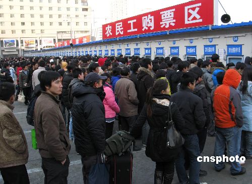 1月15日,北京西站廣場(chǎng)春運(yùn)農(nóng)民工售票窗口前,成千旅客提前多天排隊(duì)購(gòu)買(mǎi)返鄉(xiāng)列車(chē)票,購(gòu)票秩序良好。北京西站迎來(lái)春運(yùn)“農(nóng)民工返鄉(xiāng)流、學(xué)生流、探親流”的客流高峰,預(yù)計(jì)春運(yùn)期間每天到發(fā)旅客列車(chē)約280多列,客流高峰時(shí)可達(dá)20萬(wàn)人次,平均每五分鐘發(fā)一趟列車(chē)。中新社發(fā) 鄒憲 攝