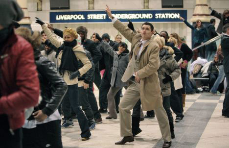 跳舞的人群中既有前來英國觀光的旅行者,也有地鐵站的工作人員,他們在一瞬間聚集,有組織的表演hip-pop、迪斯科或者舞廳舞步動(dòng)作,幾分鐘后又都忽然解散。