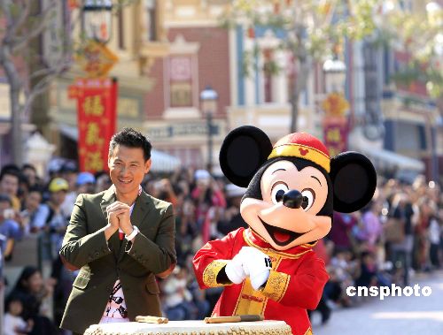 圖:張學(xué)友與卡通米奇香港迪士尼為來賓賀新年