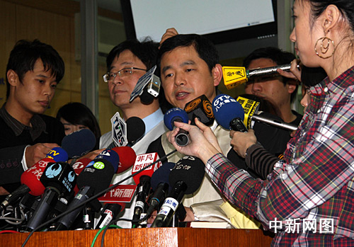 1月19日,臺(tái)北地方法院首次開庭審理前臺(tái)灣地區(qū)領(lǐng)導(dǎo)人陳水扁家弊案。傳訊陳水扁到地院準(zhǔn)備程序庭。圖為庭審后陳水扁委任律師鄭文龍(左三)、石宜琳(左二)舉行記者會(huì)。中新社記者 陳立宇 攝