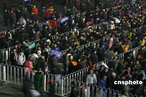 2009年1月19日晚,北京西客站客流大幅攀升,廣大旅客通過S形護欄有序進站。面對今年的春運客流,北京西站充分借鑒奧運場館觀眾分流經(jīng)驗,提前部署,及早安排,在客流密集的北廣場東西雙向設(shè)置了兩處S形護欄,由工作人員在入口處指揮,分流、引導旅客有序進站,確保了春運安全。 中新社發(fā) 魯谷 攝