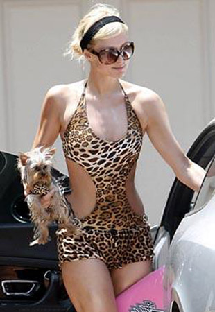 愛出風頭的帕麗斯·希爾頓不僅要把自己打扮得漂漂亮亮,就連她的寵物狗也不放過。帕麗斯外出時穿上一套性感的豹紋裝,并給她的寵物狗也穿上了一件同款豹紋裝,上面還帶有一條黑色的蕾絲裙邊,十分搶眼。