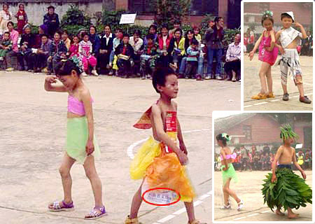 幾名小學(xué)生穿著有創(chuàng)意的服裝,利用廢舊報紙、綠葉等做成服裝道具,在一簡陋的校園操場上學(xué)著模特的貓步行走,淳樸天真的表演贏得了許多網(wǎng)友跟帖喝彩,稱“除了能宣傳環(huán)保,還能鍛煉、啟發(fā)孩子”,不過也有人并不認(rèn)可。