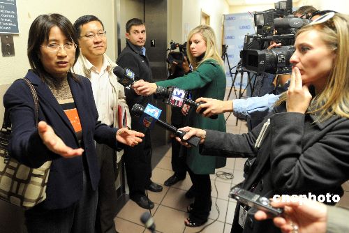 中國駐洛杉磯副總領(lǐng)事黃曉。ㄗ笠唬┰趦(nèi)華達(dá)大學(xué)醫(yī)療中心接受美國主流媒體記者采訪。中新社發(fā) 張煒 攝