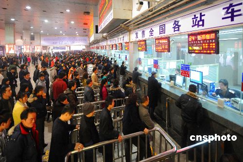 2009年2月1日消息,成都車站今年春運(yùn)在原有67個(gè)售票窗口的基礎(chǔ)上新增臨時(shí)窗口50個(gè),新開(kāi)設(shè)客票代售點(diǎn)143個(gè),有效分流車站售票壓力。今年成都車站節(jié)后春運(yùn)“買票難”得到明顯緩解。中新社發(fā) 曹寧 攝