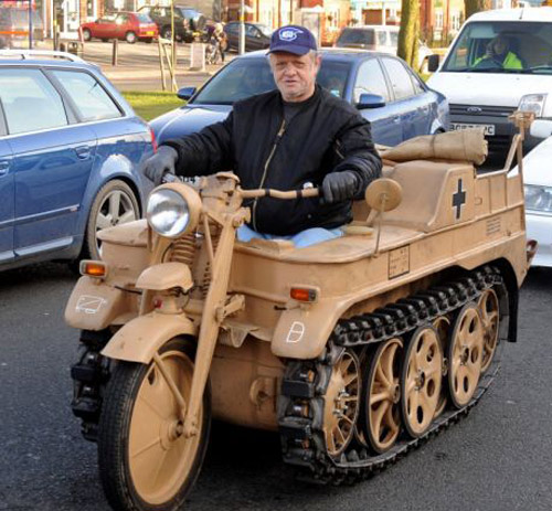 中新網(wǎng)2月2日電 據(jù)英國媒體報道,一位52歲的英國男子提姆·哈耶斯是夜班卡車司機,四年前在網(wǎng)上購買了一輛德國二戰(zhàn)半履帶式坦克裝甲摩托車,去年在車子到手后,提姆白天一有空便在大街上飆坦克車解悶,放松自我。