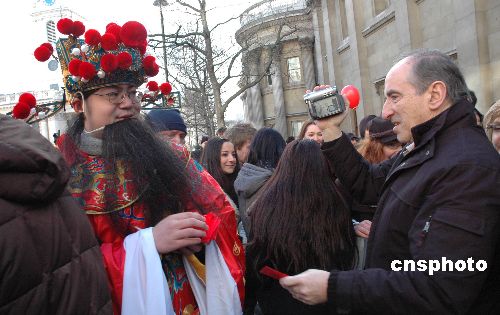 圖:中國(guó)“財(cái)神爺”倫敦派發(fā)新年紅包