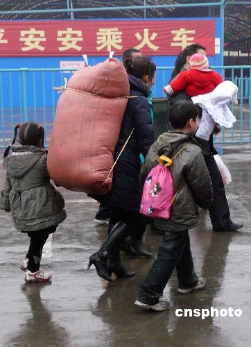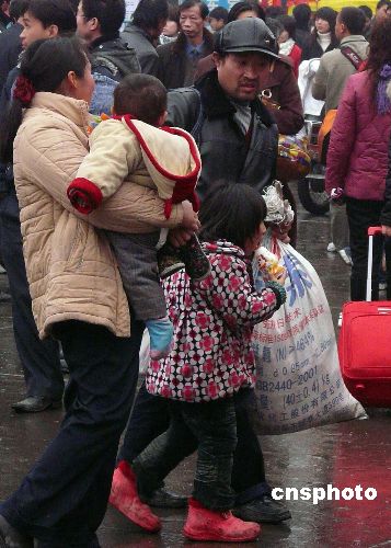 2月2日,春節(jié)過(guò)后,在湖北武漢市漢口火車站廣場(chǎng)上,不少農(nóng)民工拖兒帶女乘車外出去打工,讓這些孩子在社會(huì)生活的酸甜苦辣中磨練長(zhǎng)大。中新社發(fā) 李長(zhǎng)林 攝