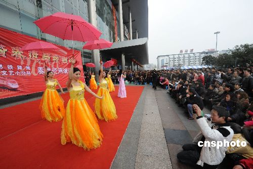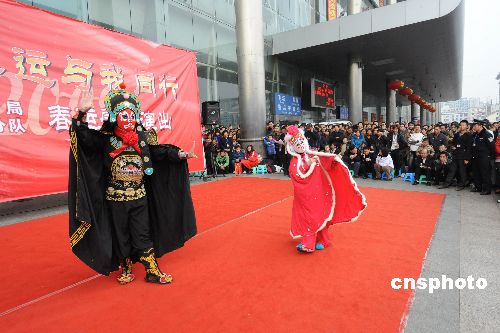 2009年2月3日,成都鐵路局文藝演出小分隊(duì)來到成都火車站進(jìn)行慰問演出,為等候乘車的旅客們表演了歌舞、獨(dú)唱、川劇變臉等節(jié)目,祝大家愉快出行、一路順風(fēng)。中新社發(fā) 曹寧 攝