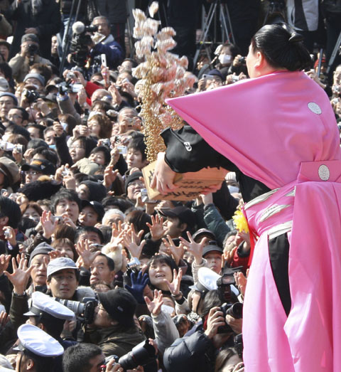 2月3日,在日本靜岡縣熱海市舉行了“撒豆子”儀式,炒熟的黃豆在日本被稱為“福豆”,儀式主辦方請來名人站在高處,將炒熟的黃豆拋向人群,以驅(qū)邪迎福,祈愿身體健康。