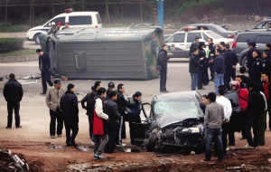 昨日(4日)一早,渝AJ0216的運鈔車在大渡口跳磴執(zhí)行完運鈔任務(wù),沿華福路返回。當車行進到一個路口時,運鈔車駕駛員李小平(音)發(fā)現(xiàn)前面一輛轎車正欲變道。
