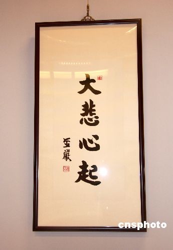 臺(tái)灣法鼓山創(chuàng)辦人圣嚴(yán)法師三日?qǐng)A寂,四日移靈金山法鼓山世界佛教教育園區(qū)大殿供信眾瞻仰,圖為法鼓山現(xiàn)正展出的圣嚴(yán)法師墨寶“大悲心起”。中新社發(fā) 陳立宇 攝
