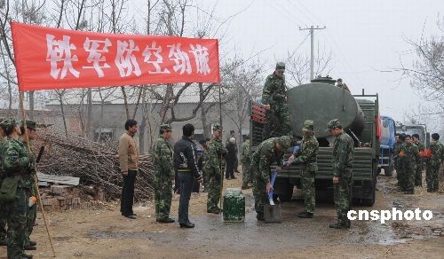 二月六日上午,駐豫六百多名解放軍官兵專程趕赴民眾吃水困難的河南省新鄭市辛店鎮(zhèn)李莊村,將“甘霖”送入民眾家中。二00八年十一月以來,河南省氣偏高,干旱少雨,遭受自一九五一年以來的特大旱情,農(nóng)作物受旱面積達(dá)到百分之六十三點(diǎn)一,四千一百多萬畝麥田受旱災(zāi),部分地區(qū)出現(xiàn)臨時(shí)性人畜飲水困難。