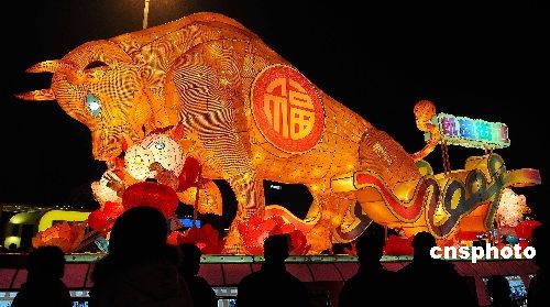 2月8日晚上,浙江杭州各文化廣場(chǎng)的“牛”燈都亮起來了,吸引了眾多市民前來觀看。中新社發(fā) 引煒 攝