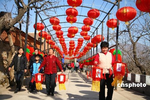 2月9日,紅廟村紅燈籠走廊。當(dāng)日,北京市懷柔區(qū)紅廟村隆重舉辦“北京九渡河首屆元宵燈會”,從入村路口到進村街道直至村內(nèi)的大小巷道,萬盞花燈,營造出一片燈的海洋。