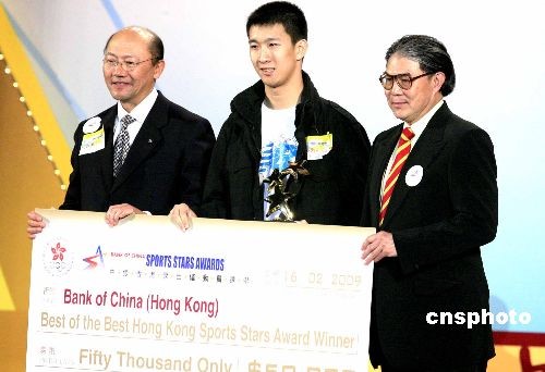 二月十六日,“2008中銀香港杰出運動員選舉”得獎結(jié)果在香港會展中心舉行的頒獎典禮上揭曉。圖為國際奧委會委員、中國香港體育協(xié)會暨奧林匹克委員會會長霍震霆(右一)等為“中銀香港星中之星香港杰出運動員大獎”獲獎?wù)咛K樺偉(中)頒獎。中新社發(fā) 張勤 攝
