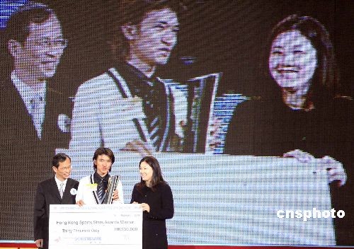二月十六日,“2008中銀香港杰出運(yùn)動(dòng)員選舉”得獎(jiǎng)結(jié)果在香港會(huì)展中心舉行的頒獎(jiǎng)典禮上揭曉。圖為香港特區(qū)立法會(huì)主席曾鈺成與伏明霞為香港杰出運(yùn)動(dòng)員黃金寶頒獎(jiǎng)。中新社發(fā) 張勤 攝