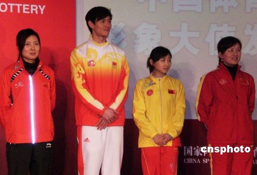 2月17日,中國(guó)國(guó)家體育總局體育彩票管理中心在北京舉行儀式,聘請(qǐng)六位體育明星擔(dān)任中國(guó)體育彩票公益形象大使。其中有杜麗、仲滿、何雯娜、張娟娟(從左至右)等四位北京奧運(yùn)會(huì)冠軍。中新社發(fā) 沈晨 攝