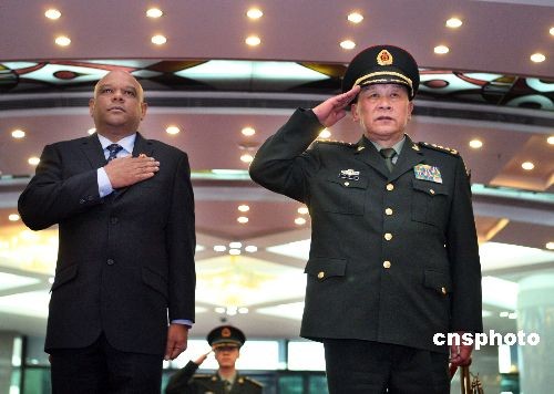 2月19日,國(guó)務(wù)委員兼國(guó)防部長(zhǎng)梁光烈上將在北京八一大樓會(huì)見來訪的馬爾代夫國(guó)防與國(guó)家安全部長(zhǎng)費(fèi)薩爾一行。中新社發(fā) 宋吉河 攝