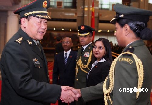 國(guó)務(wù)委員兼國(guó)防部長(zhǎng)梁光烈上將,2月19日下午在北京八一大樓會(huì)見來訪的馬爾代夫國(guó)防與國(guó)家安全部長(zhǎng)費(fèi)薩爾及其陪同人員。中新社發(fā) 宋吉河 攝