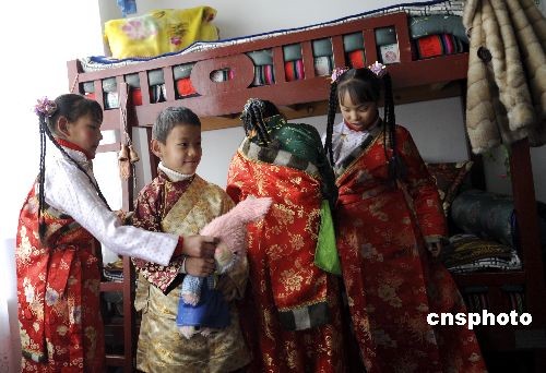 2月24日,中國藏歷年三十,拉薩SOS兒童村的藏族孤兒穿上新衣,迎接藏歷新年。拉薩市郊堆龍德慶縣乃瓊鎮(zhèn)的中國拉薩SOS兒童村,由民間慈善機構(gòu)“國際SOS兒童村組織”無償援建,目前共收養(yǎng)包括仁青多吉在內(nèi)的181名藏族孤兒,他們與17位單身媽媽一道組成17戶家庭。中新社發(fā) 廖攀 攝