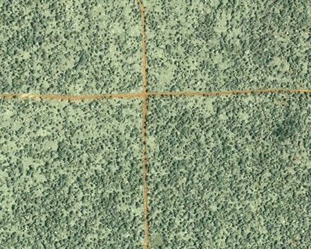 剛果森林:本圖由IKONOS商業(yè)衛(wèi)星攝于2002年6月27日,顯示的是剛果共和國北部的森林。圖中劃過中心的桔色線條是骯臟的運送木材的公路。