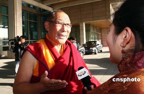 3月1日,來自西藏自治區(qū)的全國政協(xié)委員旦白尼瑪?shù)诌_(dá)北京首都機(jī)場后接受記者采訪。2OO9年全國“兩會(huì)”即將開幕,代表、委員們已開始陸續(xù)抵京報(bào)到。中新社發(fā) 杜洋 攝