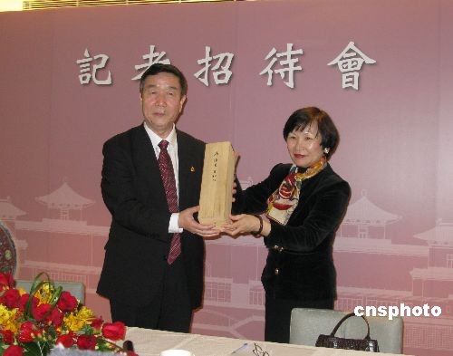 3月2日下午,臺(tái)北故宮博物院與北京故宮博物院代表在臺(tái)北故宮博物院,就2月15日雙方在北京達(dá)成的共識(shí)舉行進(jìn)一步會(huì)談,并在會(huì)后召開(kāi)記者會(huì),發(fā)表落實(shí)合作交流方案,雙方同意在不涉及名稱(chēng)載示及法令之前提下,進(jìn)行8項(xiàng)實(shí)質(zhì)性合作。根據(jù)落實(shí)方案,今年故宮兩院將舉辦首屆學(xué)術(shù)研討會(huì)并每年于7月至9月互訪、互贈(zèng)新出版品,互派人員駐訪2至3個(gè)月,協(xié)商互設(shè)商品柜臺(tái),臺(tái)北故宮今年舉辦的雍正特展向北京故宮借展27組(37件)文物等。圖為臺(tái)北故宮博物院院長(zhǎng)周功鑫(右)向北京故宮博物院院長(zhǎng)鄭欣淼(左)贈(zèng)送唐代懷素《自敘帖》的高仿真復(fù)制品。中新社發(fā) 路梅 攝