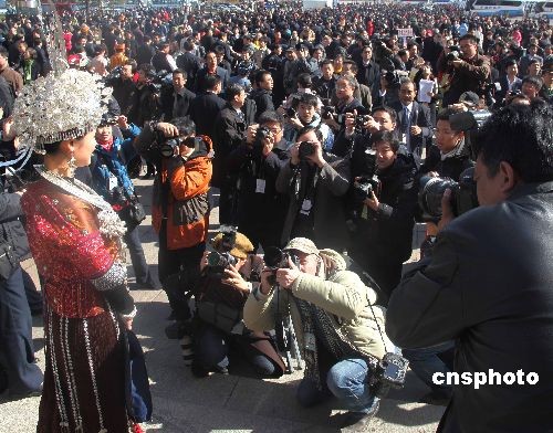 3月5日,十一屆全國人大二次會議在北京人民大會堂開幕,身著苗族盛裝的全國人大代表雷阿幼朵成為攝影記者的拍照的焦點。中新社發(fā) 張婭子 攝