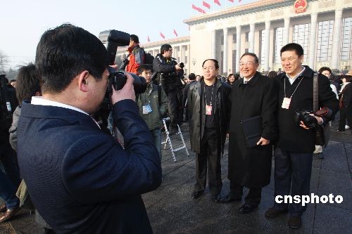 3月5日,第十一屆全國(guó)人大二次會(huì)議開(kāi)幕會(huì)在北京人民大會(huì)堂隆重舉行。圖為人大代表柳傳志在會(huì)前與記者合影。 中新社發(fā) 李松 攝