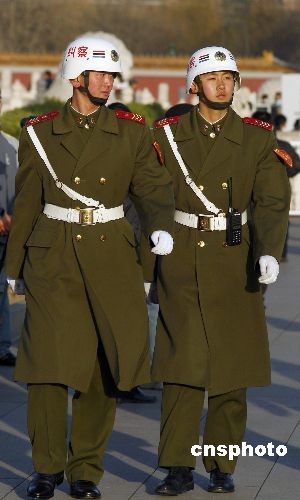 3月5日,中國軍隊(duì)糾察士兵在北京天安門廣場檢查軍容軍紀(jì)。中新社發(fā) 鄭雄增 攝