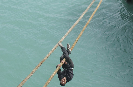 3月5日,在直布羅陀海峽的丹吉爾港,一名摩洛哥男子試圖通過繩索爬向一只駛向西班牙的船只,最終被安全人員逮捕。