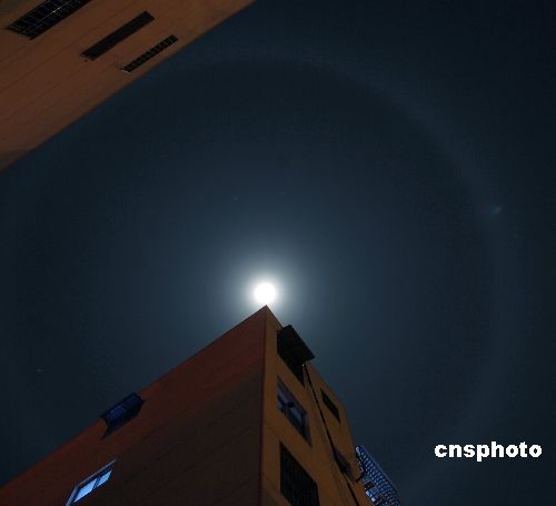 2009年3月6日21時(shí)起,山東棗莊天空出現(xiàn)罕見(jiàn)的月暈天象,甚為壯觀。據(jù)悉,月暈的形成是因?yàn)樘炜罩杏幸粚痈咴,月光透過(guò)云中的冰晶時(shí)發(fā)生折射和反射,在月亮周?chē)纬刹噬猸h(huán)。民間有“日暈三更雨,月暈午時(shí)風(fēng)”的說(shuō)法。 中新社發(fā) 劉明祥 攝