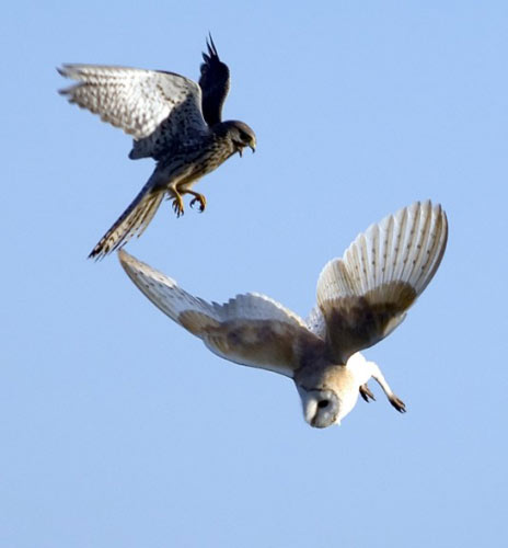 猛禽“空戰(zhàn)”。圖為一只谷倉(cāng)貓頭鷹在白天覓食時(shí)遭到兩只茶隼的伏擊的照片。