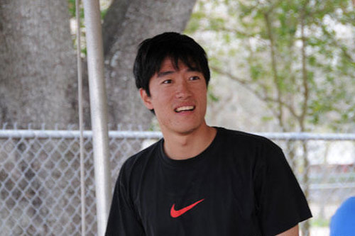 劉翔在休斯敦萊斯大學(xué)田徑場進(jìn)行體能和跨欄技能訓(xùn)練中面露笑容。
