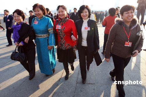 3月8日國際婦女節(jié),全國政協(xié)十一屆二次會議在北京人民大會堂舉行第三次全體會議,前來參加會議的女委員面帶微笑步入會場。中新社發(fā) 盛佳鵬 攝