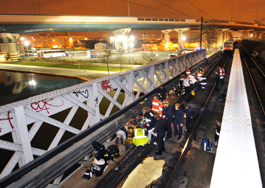 中新網(wǎng)3月8日電 當?shù)貢r間7日22時30分,巴黎北部郊區(qū)發(fā)生火車撞人事件,目前已有2人死亡,11人受傷。調(diào)查人員稱,事故發(fā)生在法國大體育館附近。當時,一群法甲里爾隊的球迷正試圖通過一條高速路上方的鐵路高架橋,以返回大巴。沒想到被隨后駛來的城鐵撞上。