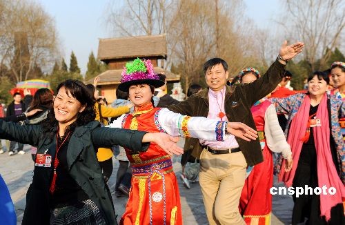 3月8日下午,出席全國政協(xié)十一屆二次會議的部分政協(xié)委員利用休會時間,來到北京中華民族博物院(中華民族園),與民族演員一起感受民族文化。 中新社發(fā) 遠(yuǎn)舟 攝