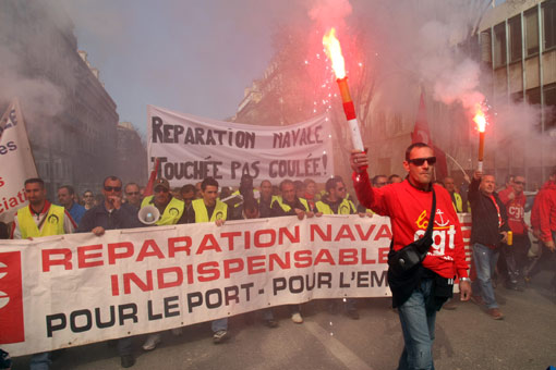 3月19日法國(guó)各大工會(huì)在全國(guó)各地聯(lián)合組織罷工和示威游行等活動(dòng),抗議薩科齊政府在應(yīng)對(duì)當(dāng)前經(jīng)濟(jì)危機(jī)過(guò)程中忽視勞動(dòng)者權(quán)益和社會(huì)福利。圖為法國(guó)城市馬賽舉行罷工游行。