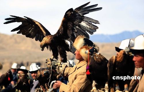 3月20日,位于新疆西部天山南脈腹地的阿合奇縣舉辦第二屆獵鷹節(jié),當?shù)乜聽柨俗巫迕癖娋奂谠摽h賽馬場,展示自家馴養(yǎng)的上百只獵鷹。當?shù)乜聽柨俗巫羼Z養(yǎng)獵鷹有著悠久的歷史,至今仍完整保留著原始的馴養(yǎng)方式,被譽為中國“獵鷹之鄉(xiāng)”,當?shù)乜聽柨俗巫逡脖蛔u為“鷹王”。他們在放牧的同時,經常騎馬到高達近百米的高山頂上,將自己馴養(yǎng)的獵鷹放飛。中新社發(fā) 劉新 攝